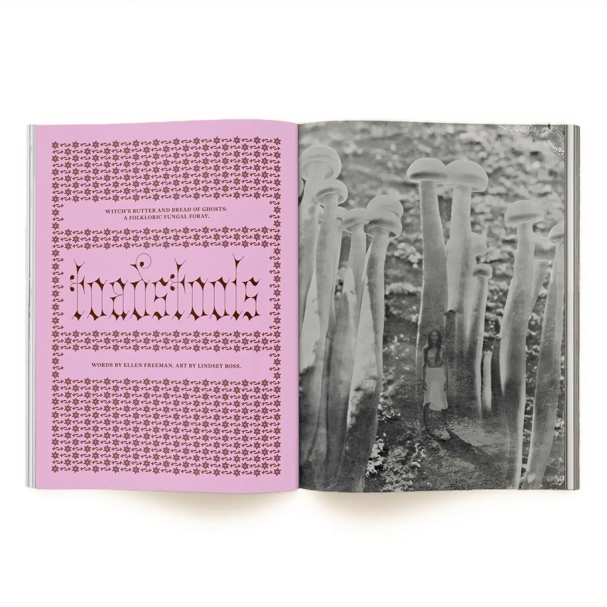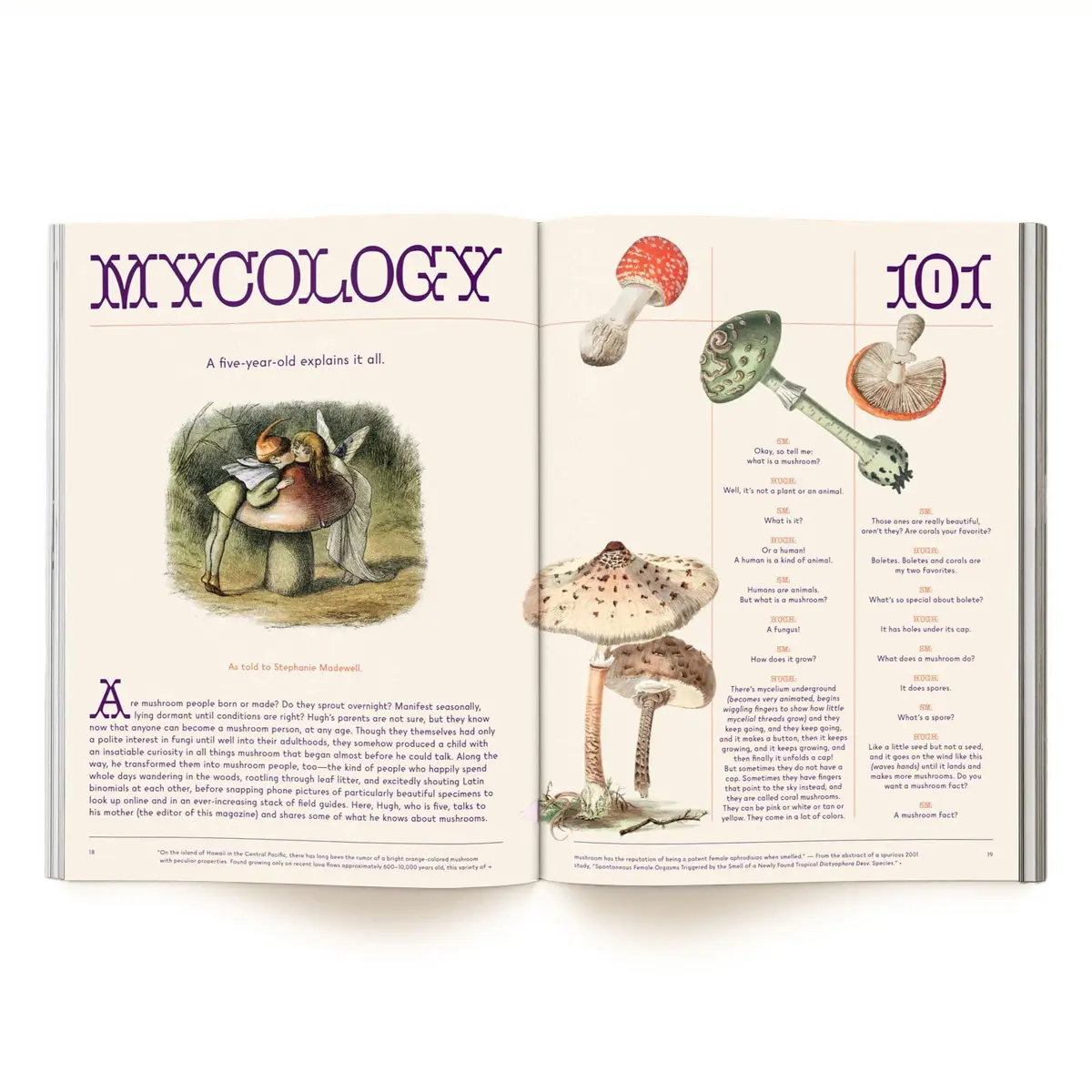 Betānija van Reišveika (Bethany van Rijswijk) iedziļinās maģisko sēņu folklorā; ar savām kompozīcijām Leslija Kirhofa (Leslie Kirchhoff) un Jasmīna Hatiba (Yasmine Khatib) pierāda, ka sēnes ir jaunie ziedi; Klēra L. Evansa (Claire L. Evans) ielūkojas pieredzes ziņojumu forumā “Erowid”, Zoja Gonga (Zoe Gong) mūs dziedē, Adrienna Kamerere (Adrienne Kammerer) glezno no gliemeža skatupunkta; Viljams Padilja-Brauns (William Padilla-Brown) runā par pilsoņu mikoloģiju, Šruti Ravindrana (Shruti Ravindran) analizē pieredžu neirozinātni, un Lio Mins (Lio Min) meklē kontrkultūras piemērus meža zemsegā. Papildus: MikoAstroloģija, Sēņu modes nedēļa, pazudušo smaržu meklējumi, kvēlojošas sēņu lampas, Mixtec transcendentālā gastronomija, sēņu apbedīšanas tērpi un daudz kas cits.